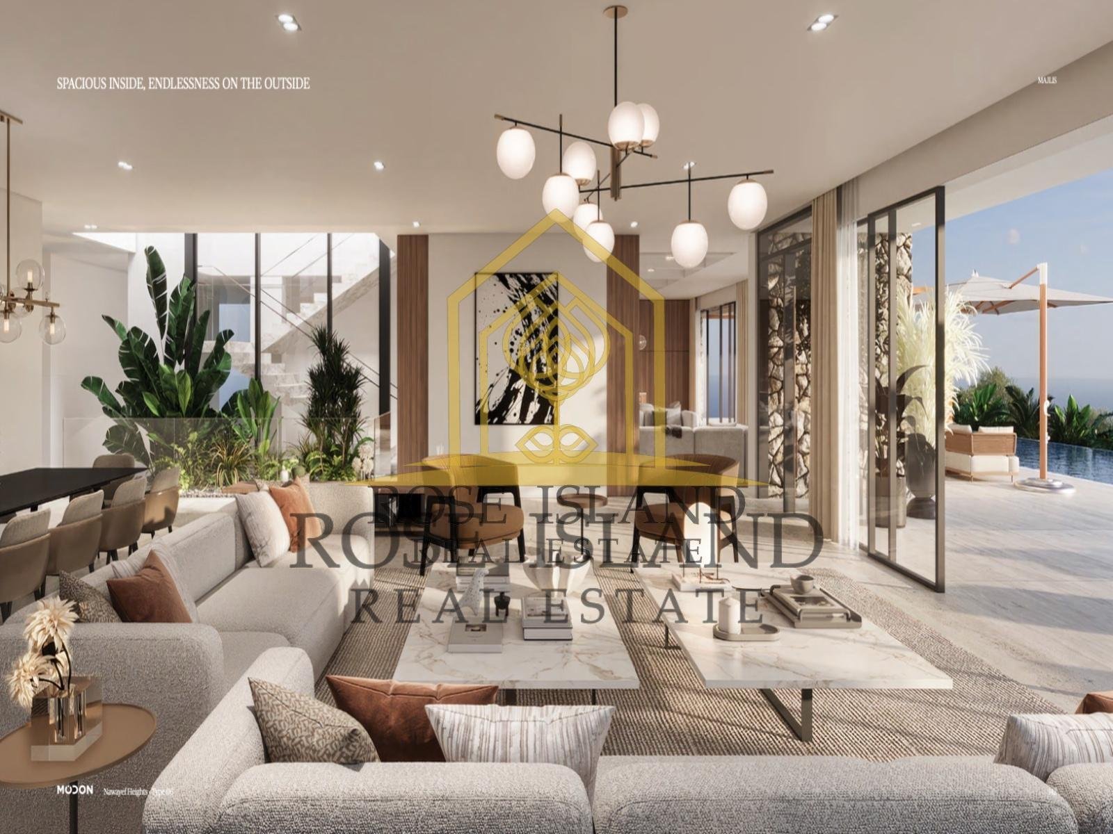 Step inside to discover an elegant world, where a spacious family room and majlis await, adorned with earthy tones, timber, and porcelain accents. The villa's thoughtful layout maximizes natural light, creating a bright and airy ambiance throughout.