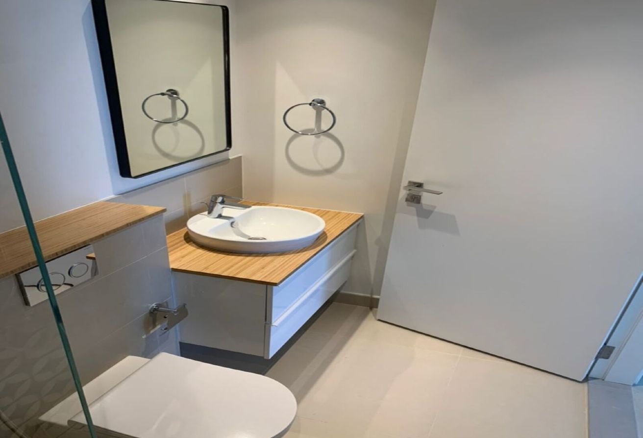 Both bedrooms are generously sized, featuring built-in wardrobes and plush carpeting for a cozy retreat. The master bedroom includes an en-suite bathroom with contemporary fixtures and a stylish design, while a second well-appointed bathroom serves the rest of the apartment.